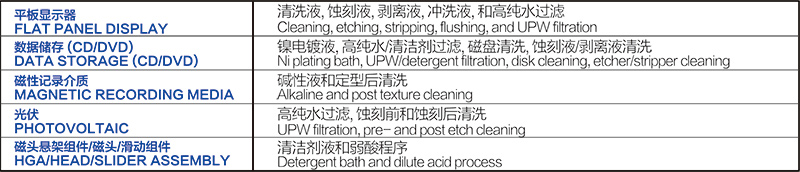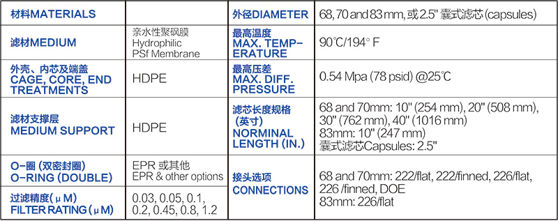 ● 用高度非对称性结构亲水性聚砜薄膜滤材,并以HDPE做支撑层和配件,以提供高纯度折叠滤芯或囊式滤芯,适用于高纯水和弱酸/弱碱液过滤。