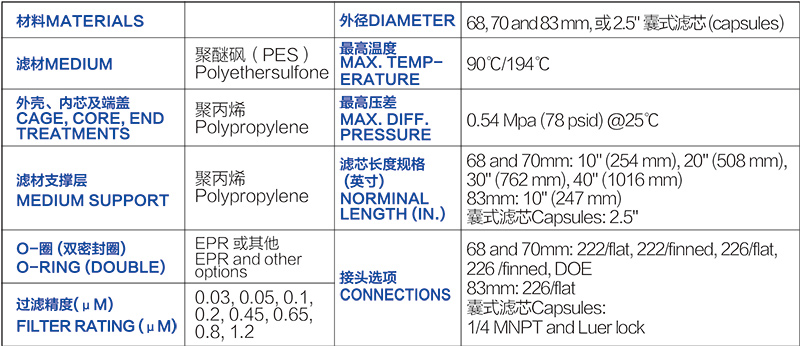 ● 用高度非对称性结构亲水性聚砜(PSf)或聚醚砜(PES)薄膜滤材,折叠滤芯或囊式滤芯,适用于高纯水和弱酸/弱碱液过滤。