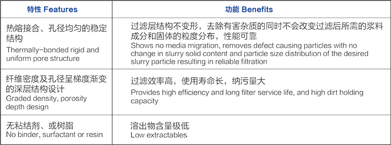 Duraklean™ SL深层式滤芯为各类含有粉体,浆料配方的液体提供了有效的方法。Duraklean™ 深层式滤芯凭借过滤纤维密度或孔径呈梯度渐变的设计确保需要被除去的杂质按照其粒径大小分布尽可能均匀的分布在滤芯的整个过滤截面。过滤后所需的浆料含量和固体的粒度分布不会改变。因此,在浆料的制造过程中品质可以保证始终如一。 Duraklean™ 深层式滤芯展现卓越的微粒捕捉性能,同时拥有较长的使用寿命,可以有效地降低总体过滤成本。