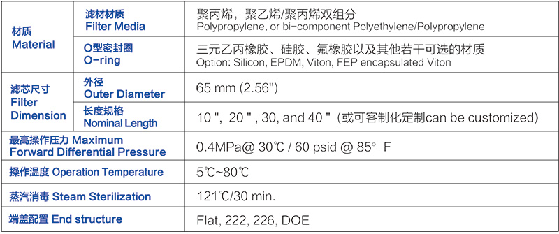 当这种双成分长线纤维经过热处理过后,形成严紧的三维结构。这种滤芯坚体结构使得滤芯不需要支撑柱, 同时使过滤拦住的渣物不致于因纤维的松动而脱落到滤液中,造成再次污染的可能性。更有甚者, 这种坚体结构在处理可变形的颗粒物时, 可以使孔径大小和深层结构在滤芯使用期内不改变。DuraKlean™ 系列滤芯外径是65mm,一般长度是10,20,30,和40英寸,但可以客制化到任何其他长度。